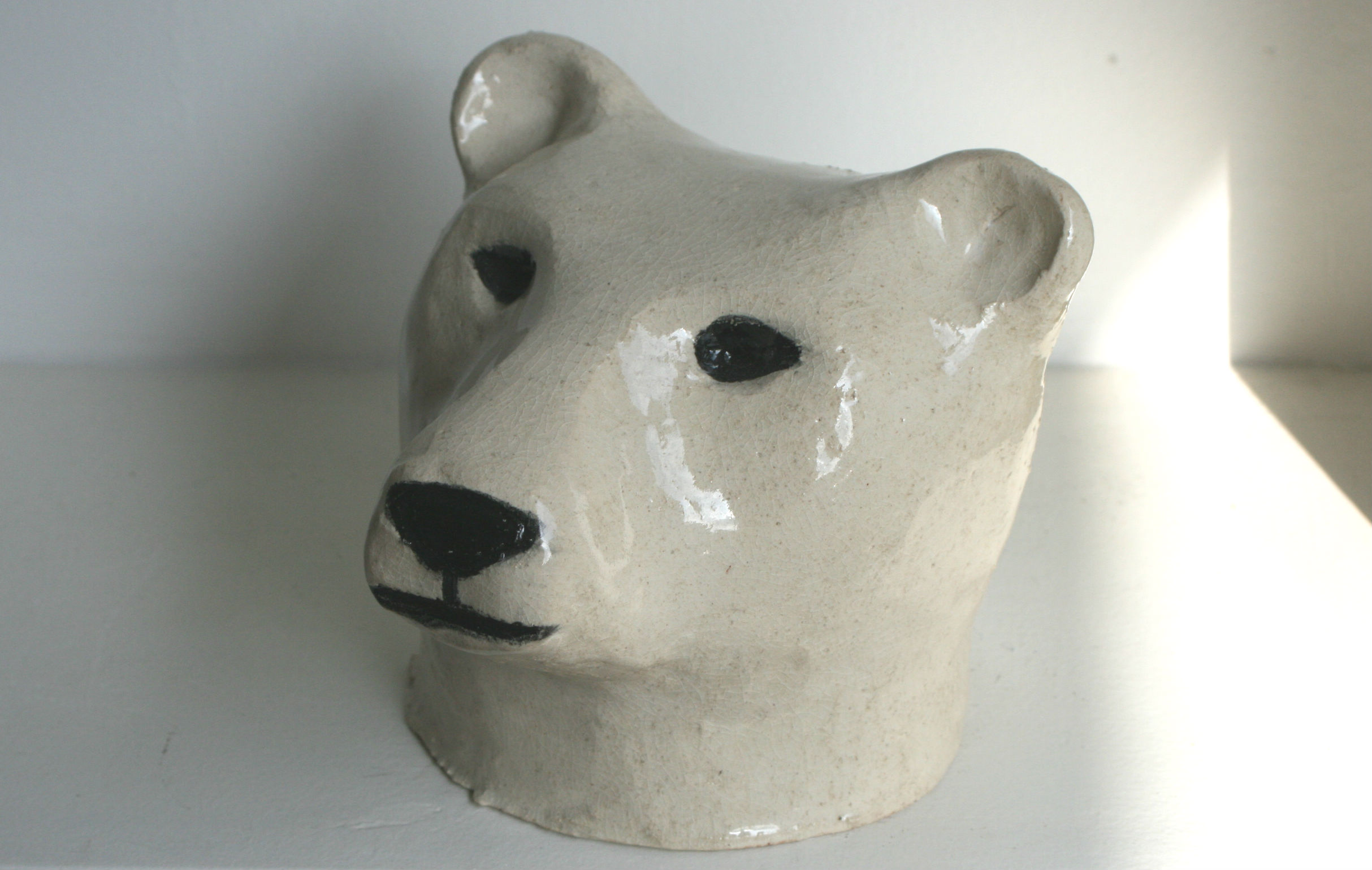 Cette tête d’ours polaire en terre chamottée et recouverte d’émail craquelé transparent est inspirée d’une image piquée sur Pinterest, épinglée à partir d’un site qui malheureusement ne semble plus exister. C’est un camarade d’atelier portant le fantastique pseudo de Montagne Ananas sur Pinterest, qui me l’a fait découvrir. Son compte est une véritable mine d’inspiration pour moi car lui aussi aime particulièrement modeler des animaux en argile. Son dernier en date adopte d’ailleurs une position pour le moins… étonnante. Enfin non, finalement, pas si étonnante pour un chien qui fait sa toilette intime ! J’ai vraiment hâte de voir le résultat et je ne manquerai pas de le partager dans l’atelier de Favelle si Montagne Ananas me donne sa bénédiction.