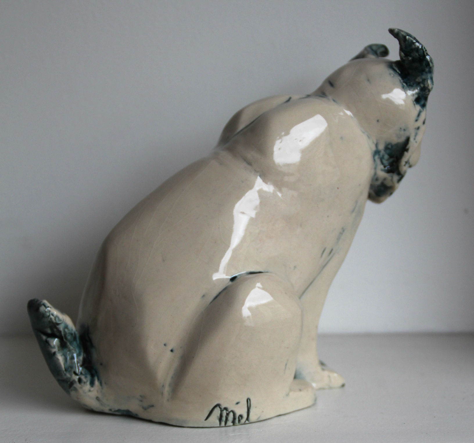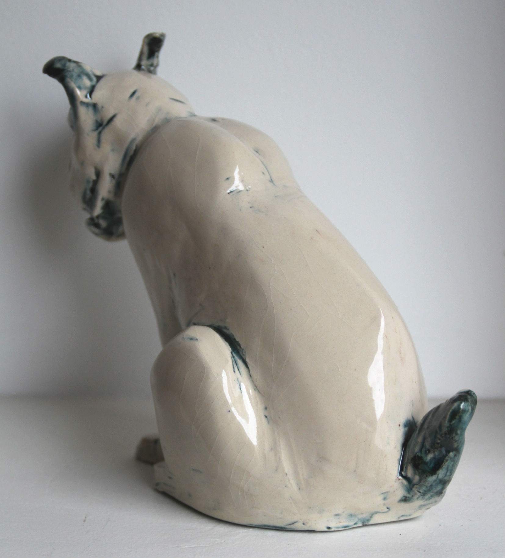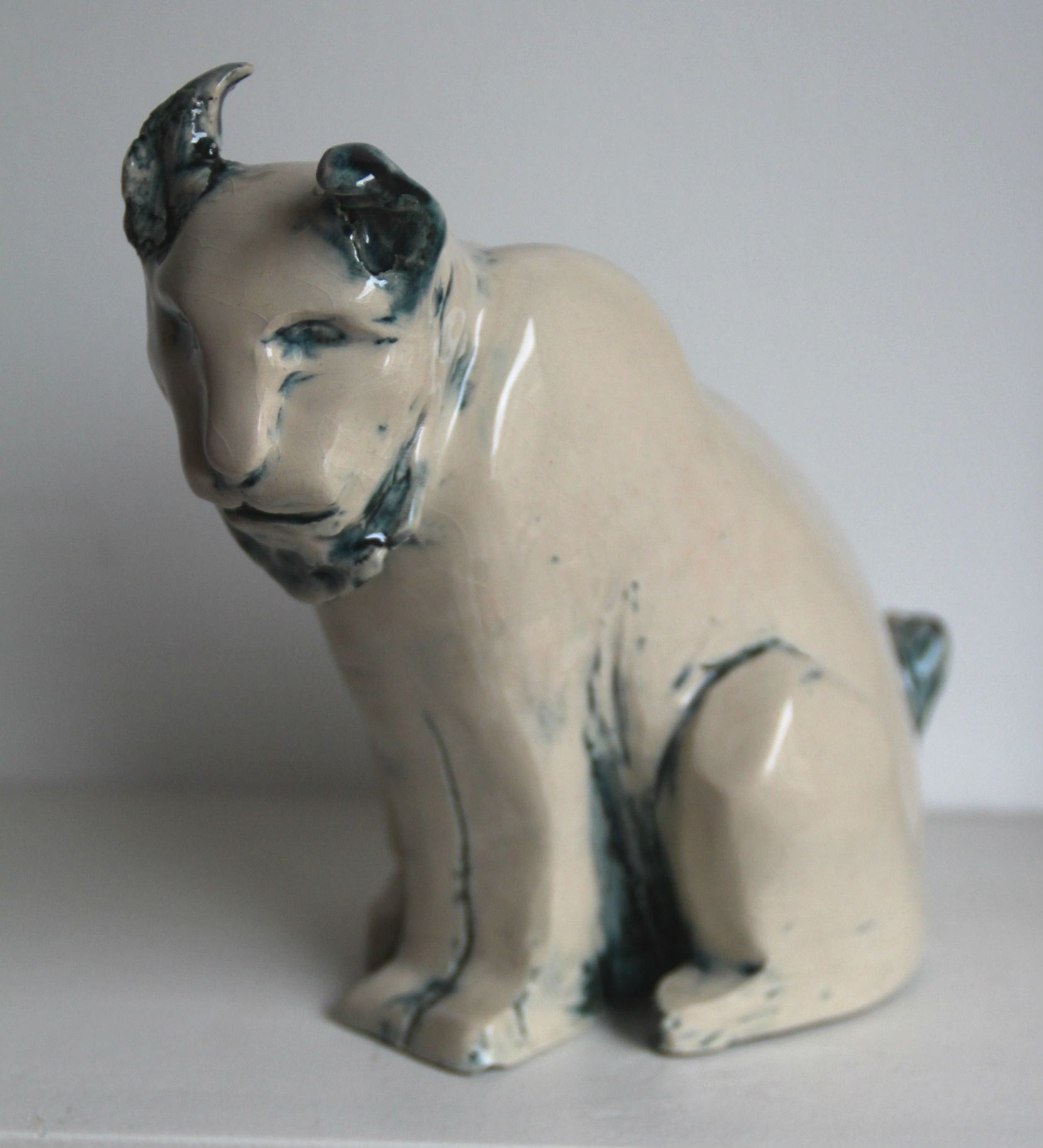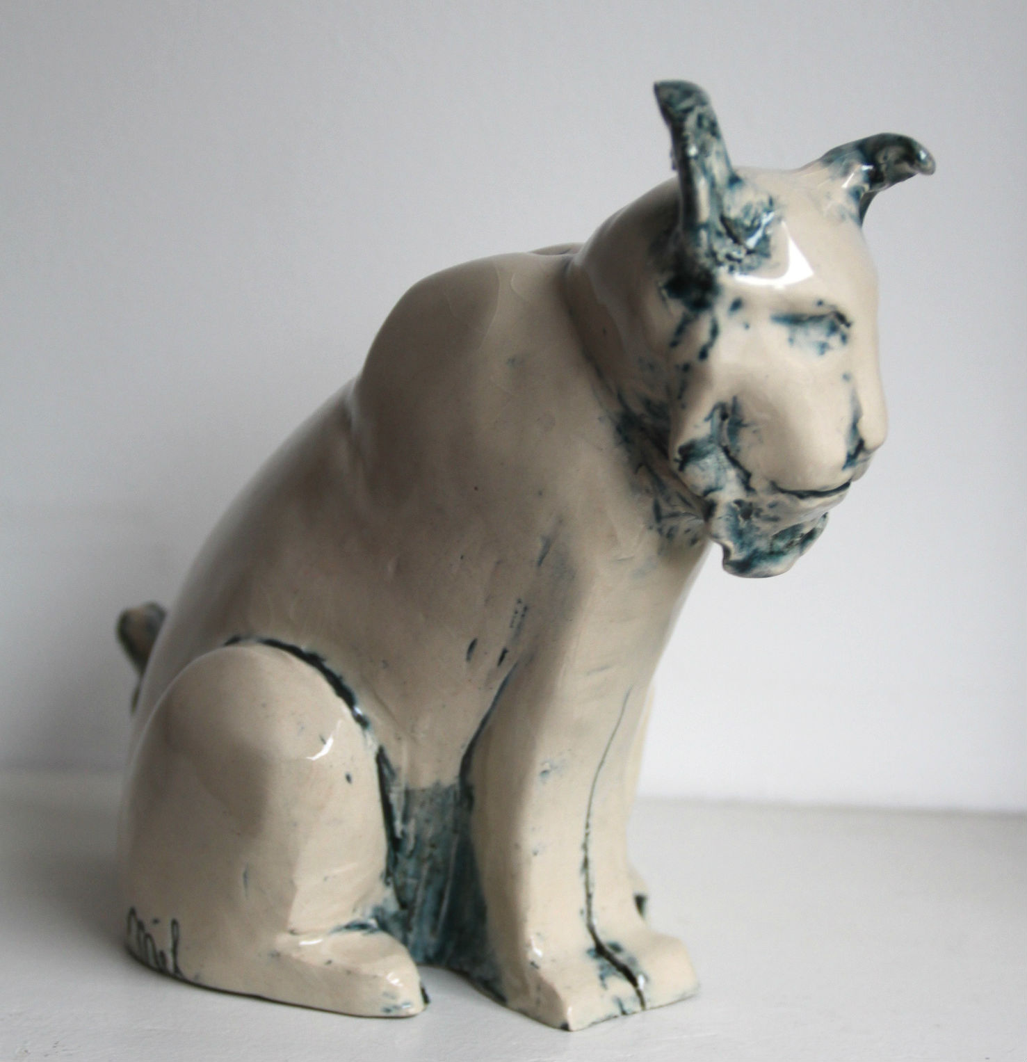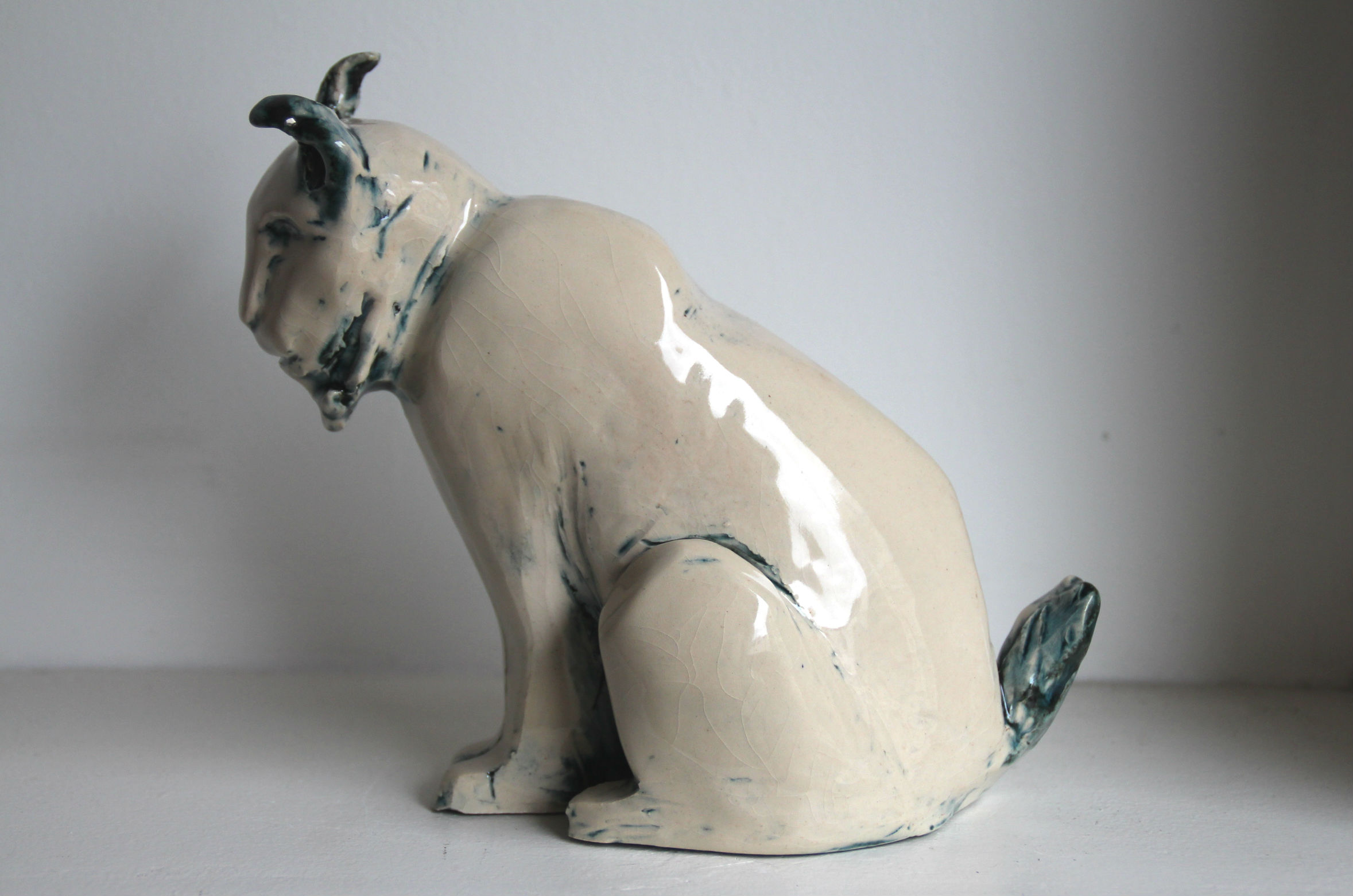 « Si tu ne sais pas quoi faire, modèle des animaux, tu verras, c’est apaisant… ». Voici le premier conseil de mon prof d’atelier, il y a trois ans. Je l’ai suivi à la lettre et j’ai pu constater le pouvoir réconfortant du modelage de bêtes à plumes, à poils, à coquille et à écailles ! Mon premier fut un escargot noir et blanc, puis une chouette aux yeux grands ouverts, un lapin nain, un ours blanc, un pingouin à tête de cobra, une carpe japonaise, une tête d’ours polaire… et enfin ce lynx en terre blanche émaillée black tulip, mon émail préféré car il donne un effet bleuté. J’aime bien son air à la fois tranquille et à l’affût, avec cette oreille en mouvement. Comme s’il venait d’entendre un bruit, un frémissement.