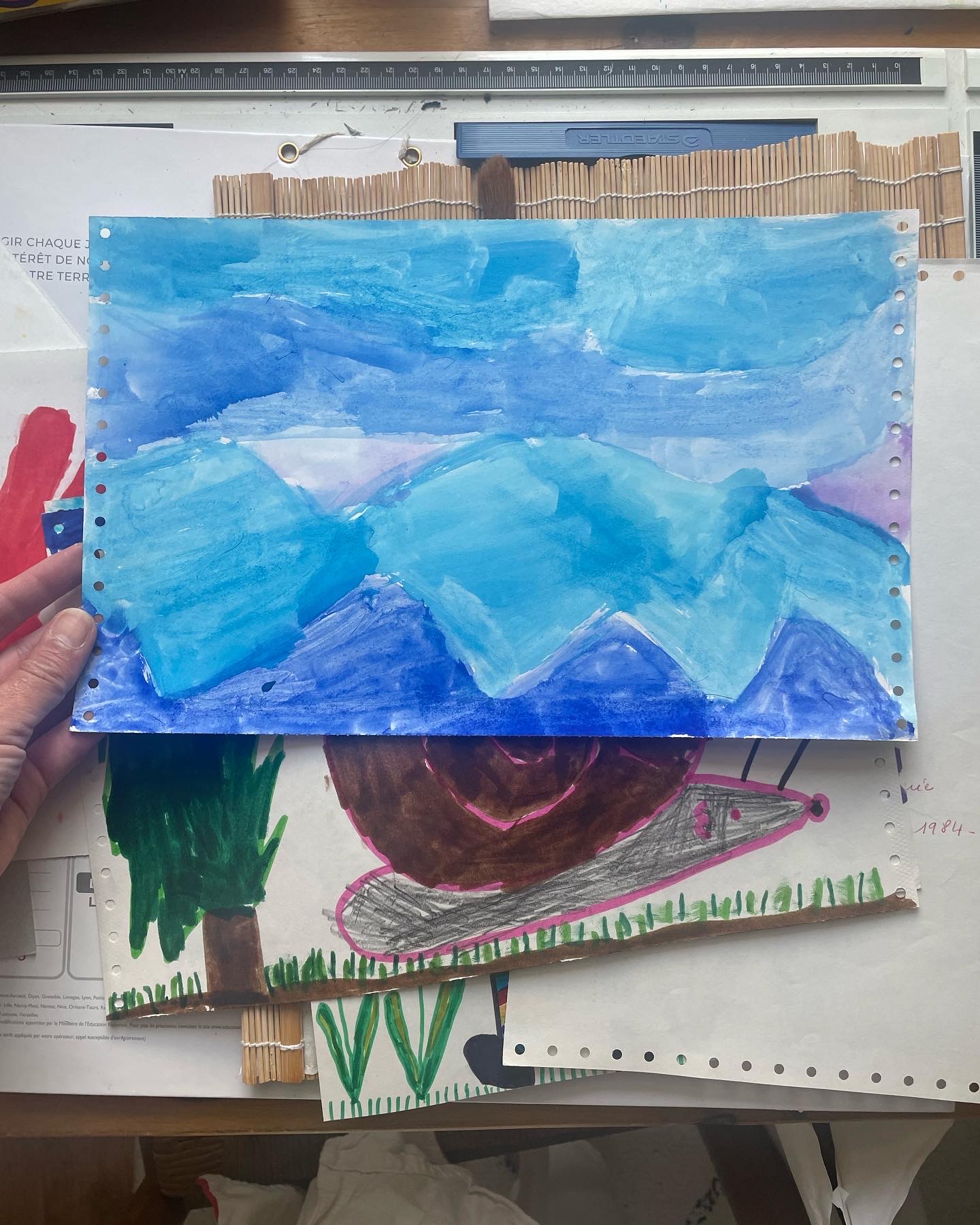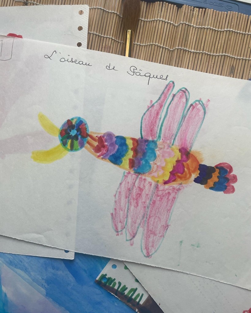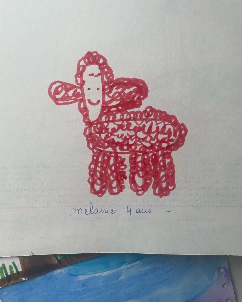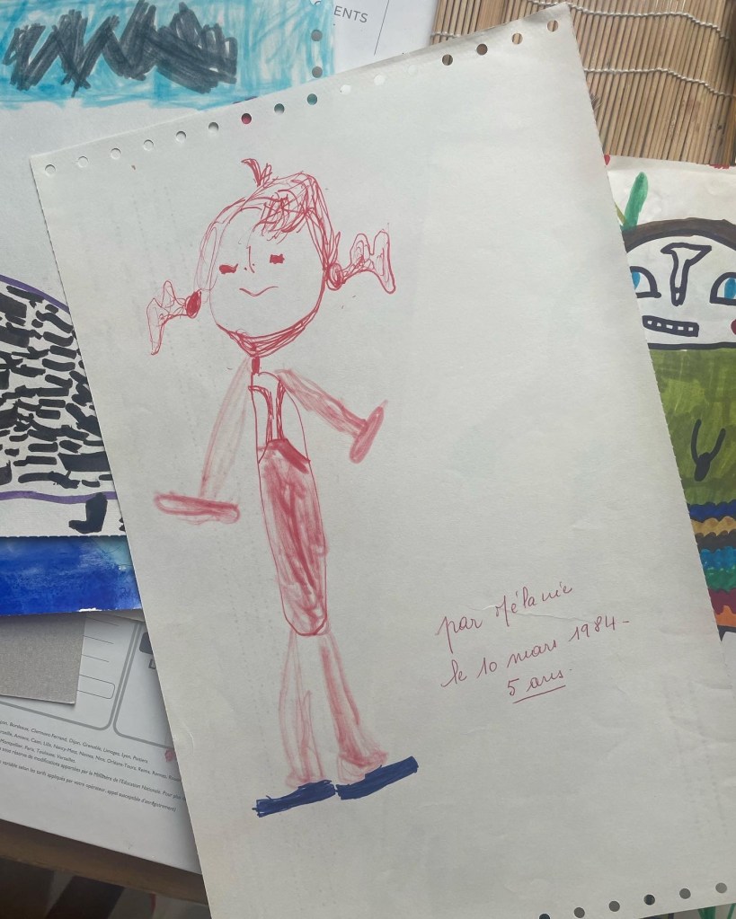 Je me sens tellement reconnaissance vis à vis de ma mère d’avoir conservé cette partie de mon enfance intacte. Certains dessins sont même parfois datés et légendés de sa main. « Mélanie 4 ans », « l’oiseau de Pâques », « Isabelle par Mélanie »… des annotations qui laissent deviner ce que ELLE avait le plus aimé de cette production foisonnante et brouillonne. Ce à quoi elle accordait le plus de valeur.